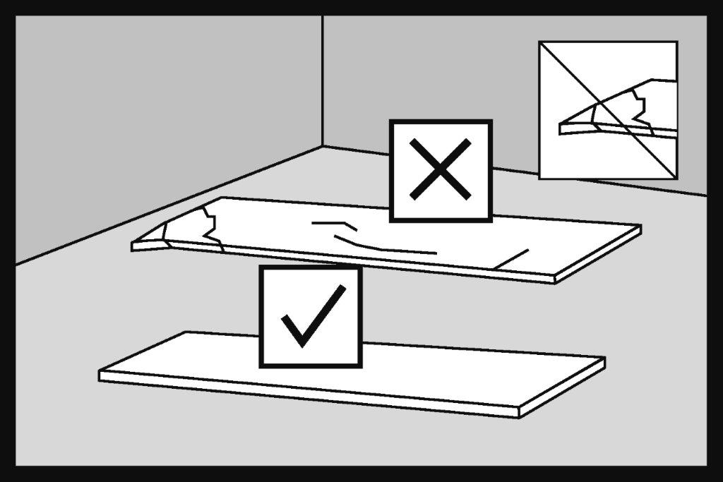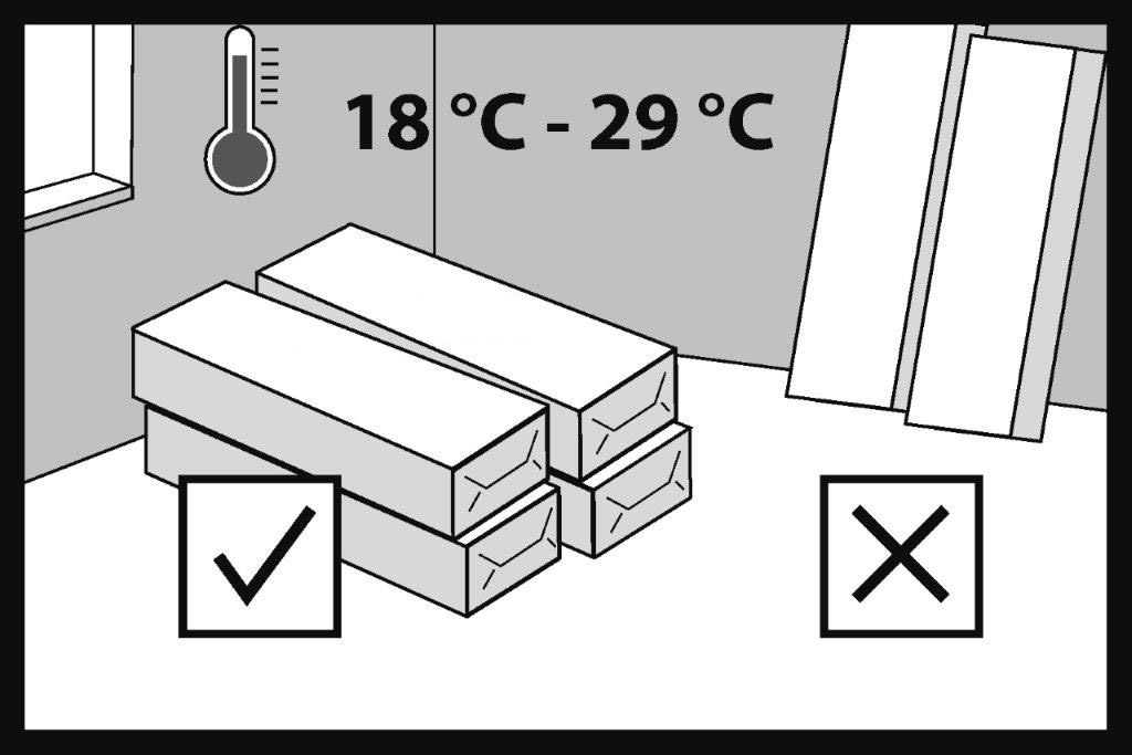 Podlaha by měla být skladována v původním obalu v místnosti, kde má být položena, po dobu alespoň 24 hodin, aby se zajistila její aklimatizace. Teplota vzduchu by měla být od +18°C do +29°C.