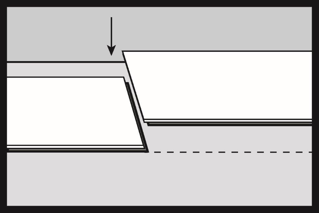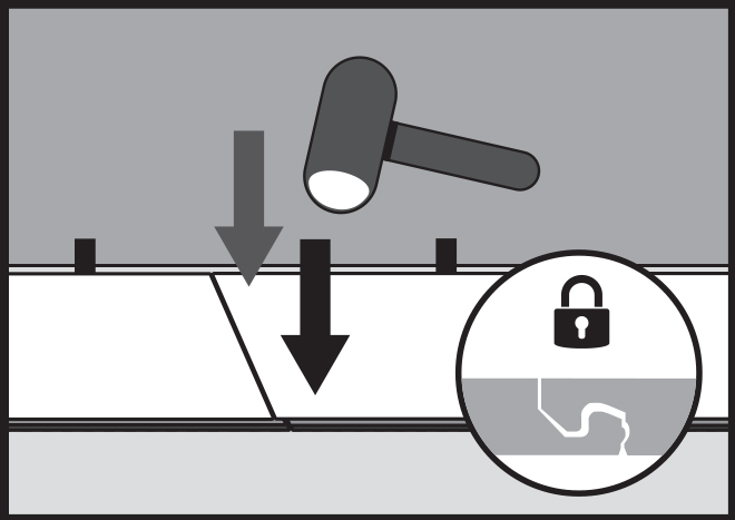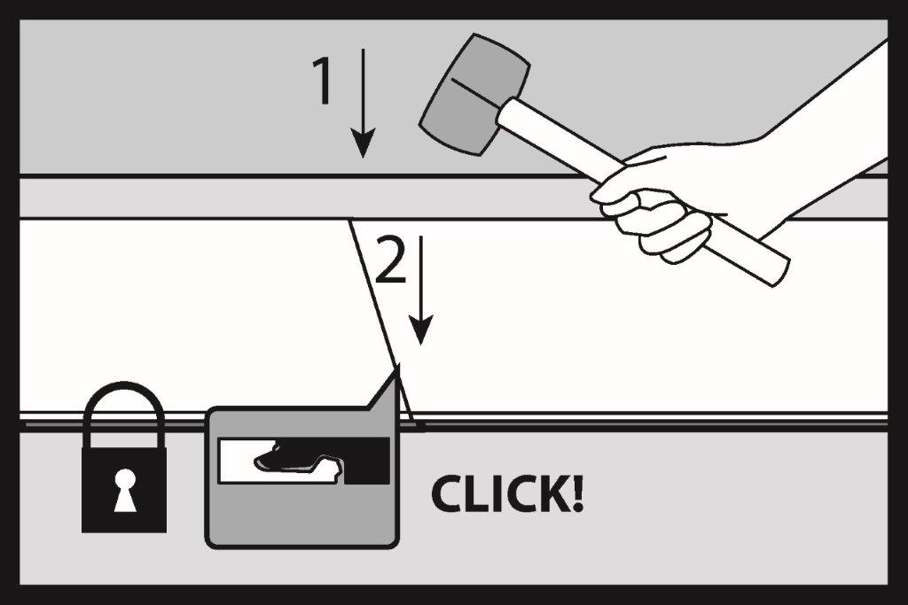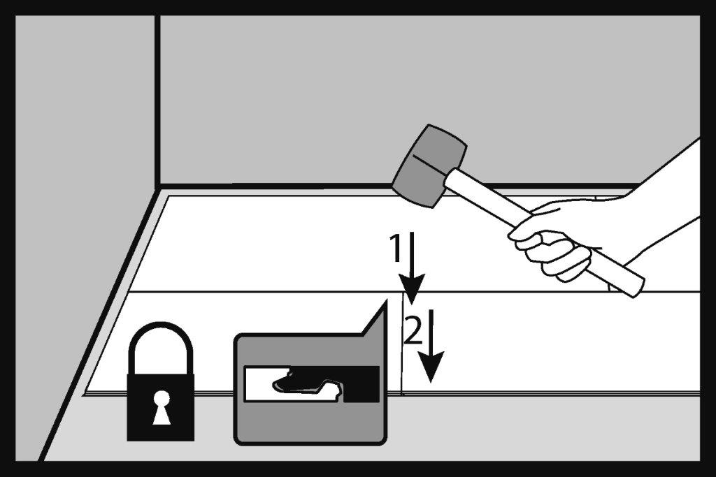 Jemně poklepejte gumovým kladivem (s pískem nebo z bílé gumy) na spoj okrajů a uzavřete zámek podle pořadí poklepání 1 a 2. Při správně uzavřeném zámku by měly být povrchové vrstvy panelů v jedné rovině a mezi spojenými prvky by neměla být viditelná žádná výšková nerovnost.
