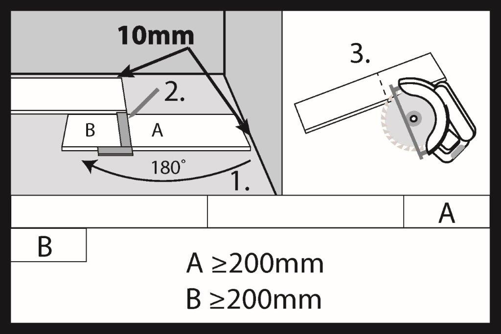 K řezání panelů můžeme použít ruční nebo elektrickou pilu. Pamatujme, že po odříznutí posledního panelu je třeba nechat dilatační spáru o šířce minimálně 10 mm. Doporučená délka posledního odříznutého panelu (A) v prvním pásu podlahy by měla být minimálně 200 mm. Pokud má odříznutý kus (B) délku přes 200 mm, můžeme jej použít k zahájení montáže druhého pásu podlahy. Vzdálenost mezi čelními spoji ve dvou sousedících pásech podlahy by měla být minimálně 200 mm.