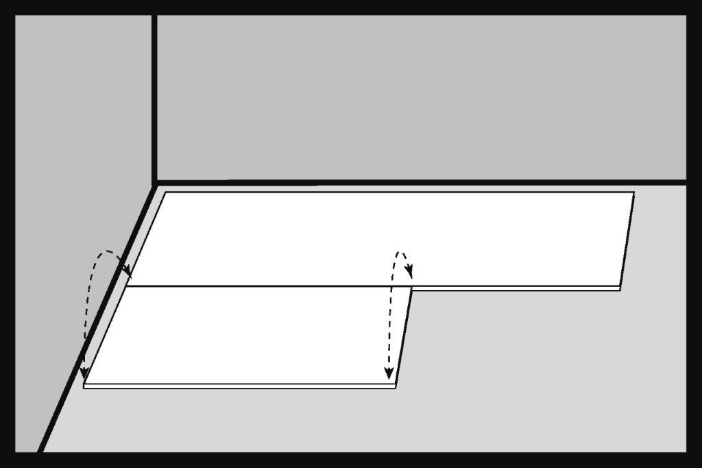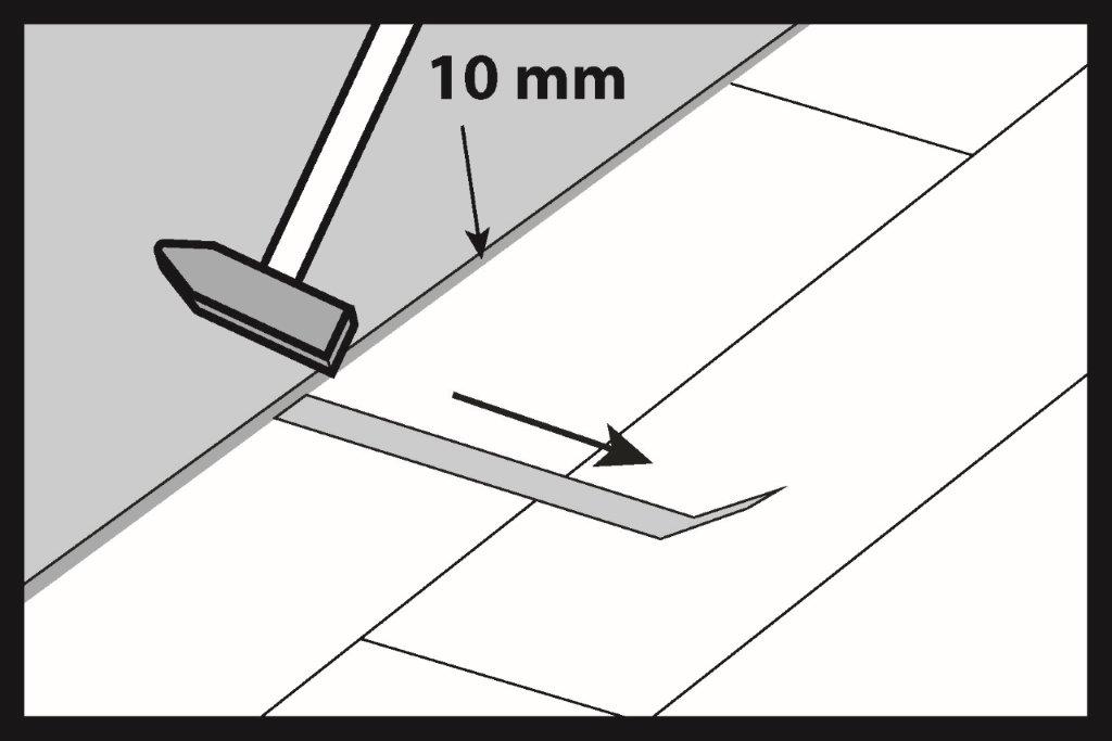 Montáž začínáme z levé strany stěny a pokračujeme směrem doprava. Velikost dilatační spáry by měla být minimálně 10 mm. K udržení stejné velikosti spáry mohou být užitečné dilatační klíny. Dilatační spára by měla být provedena po obvodu místnosti a kolem všech dalších překážek, jako jsou sloupy, schody, keramické dlaždice atd.