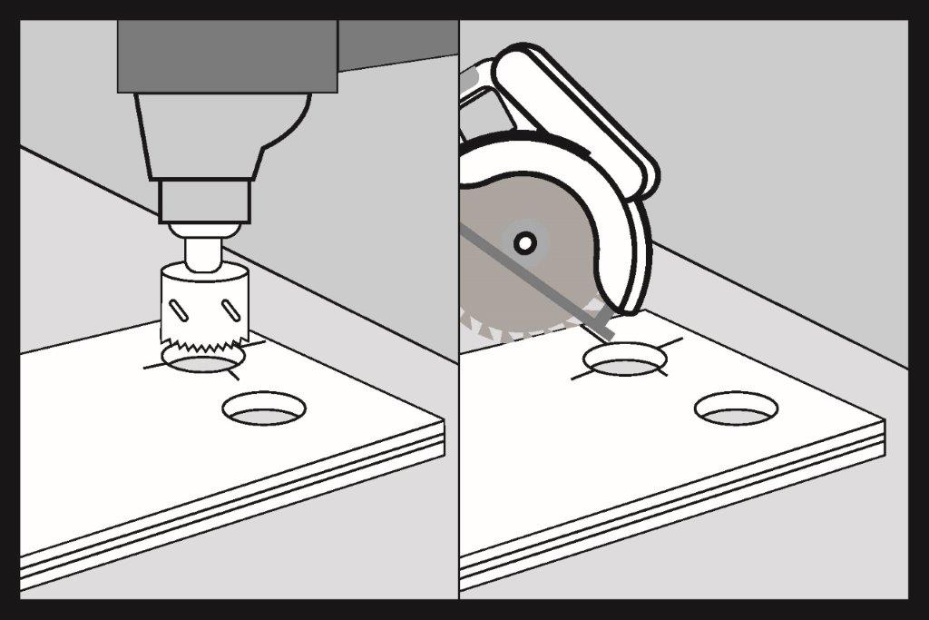 Vyřízneme otvory v panelu SPC. Nakreslíme čáru procházející středem otvorů a pomocí pily panel rozřízneme.