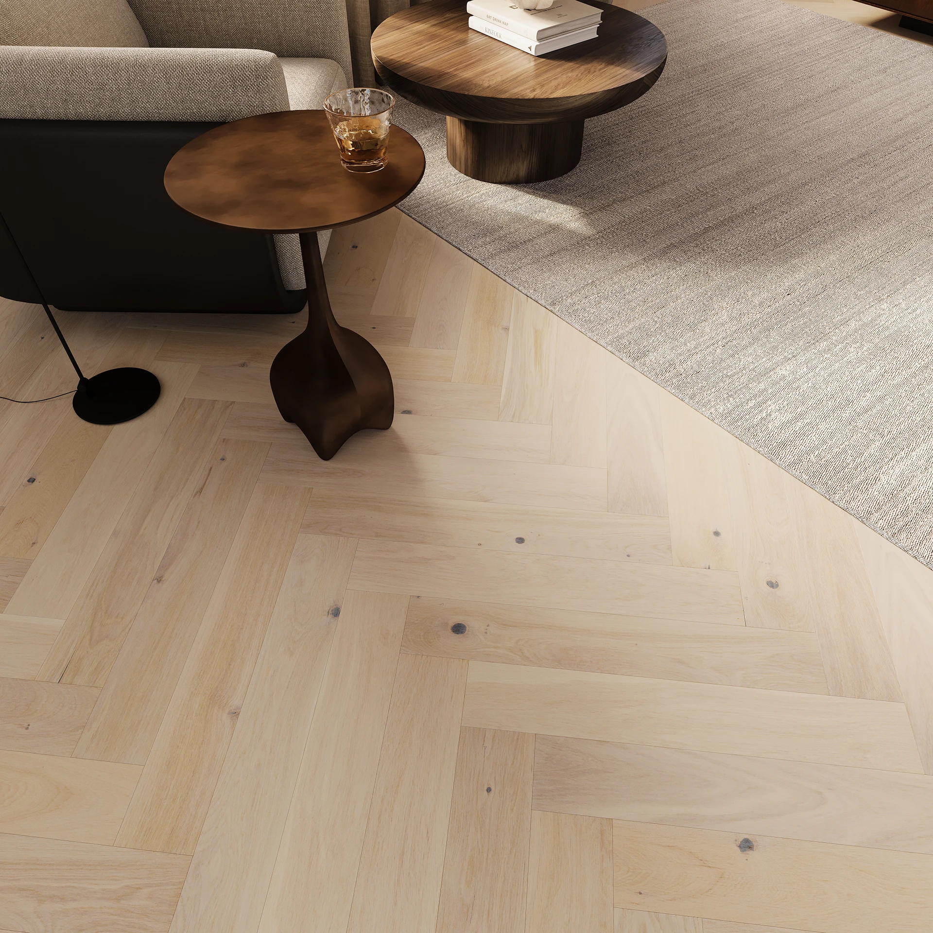 Dubová podlaha perleťově bílé barvy. Lamely jsou kartáčovány, což zvýrazňuje přirozenou strukturu dřeva, a čtyřstranná mikrofáze zdůrazňuje subtilnost a lehkost. Ošetřena jemným matným lakem.