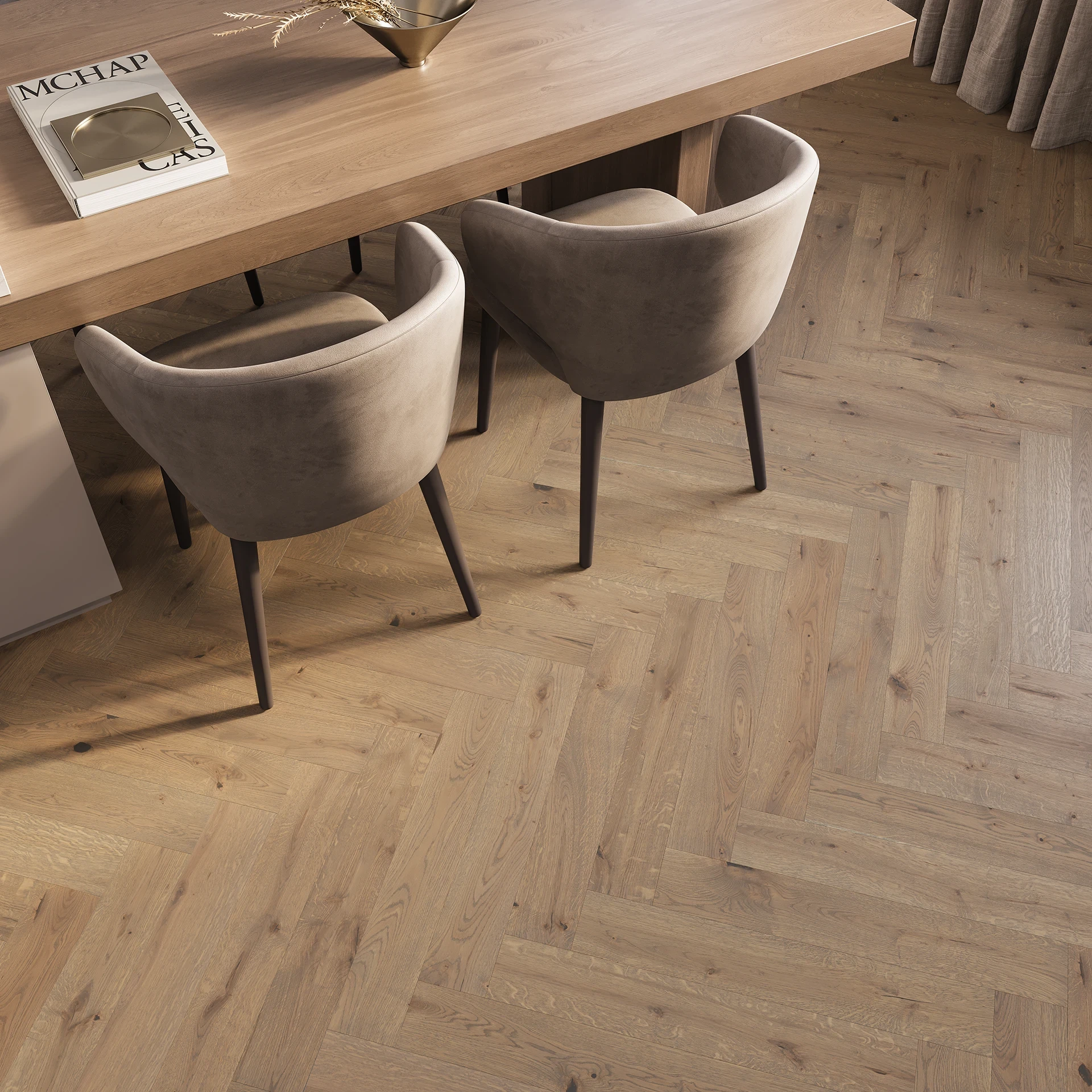 Dubová podlaha v odstínu béžové a šedé s celou řadou přírodních charakteristik dřeva. Díky kartáčování je zvýrazněna kresba dřeva a čtyřstranná mikrofáze přidává podlaze na ušlechtilosti. Pokrytá matným lakem.